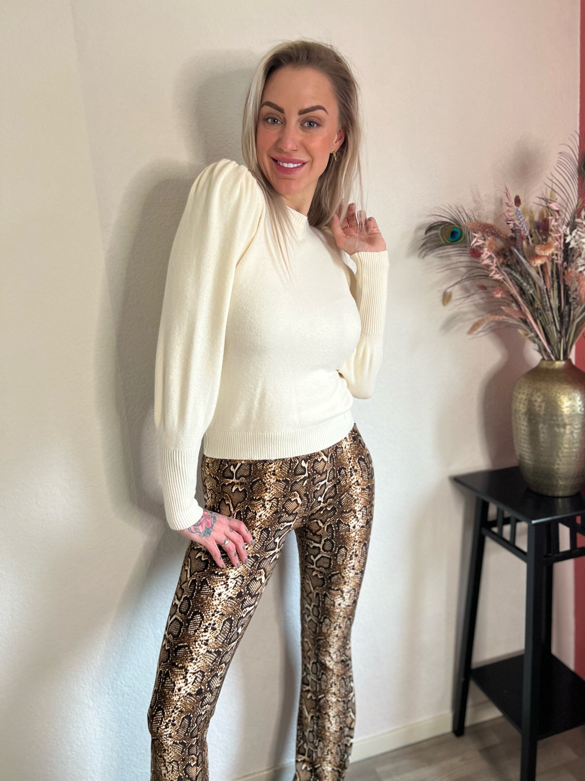 Helemaal hip dit seizoen, de print flair broek met elastische taille. Eindeloos te combineren, met een gekleurde sweater kan je alle kanten op.